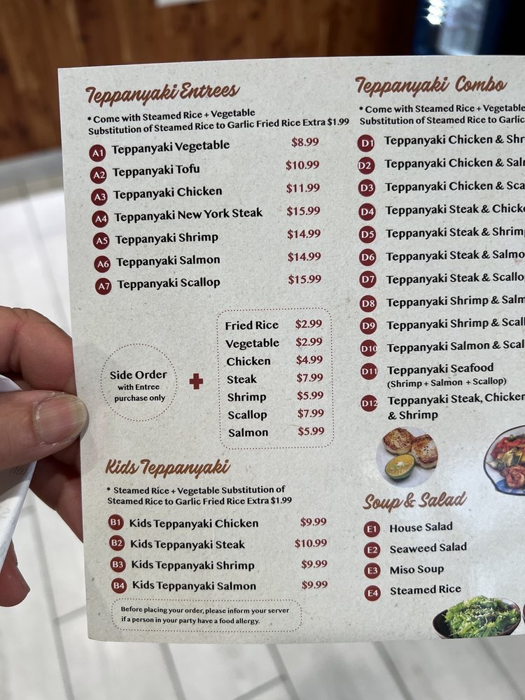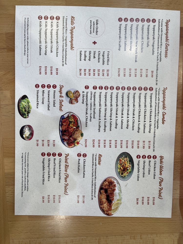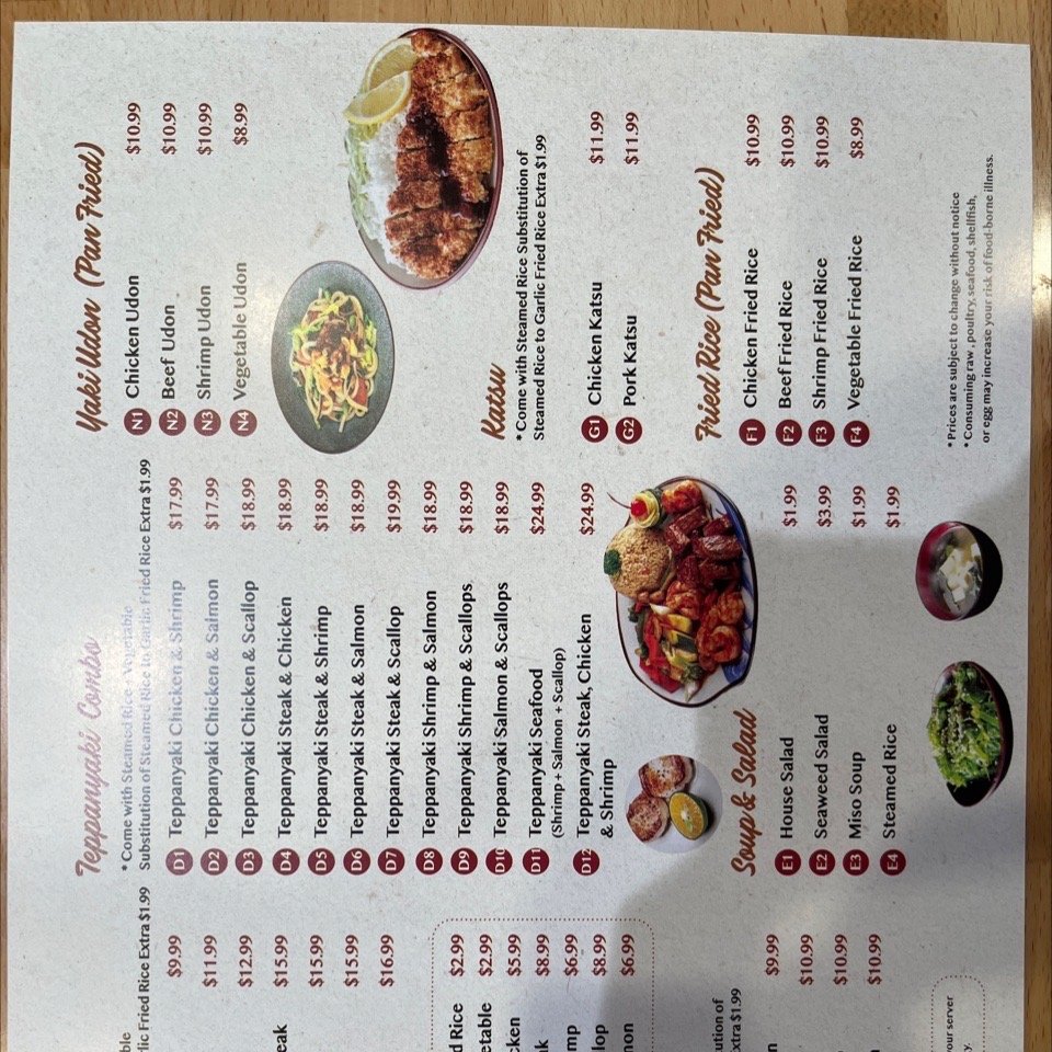 At Fuji Grill, guests can indulge in a variety of dishes, from the comforting Miso Soup and refreshing Seaweed Salad to the hearty Yaki Udon selections featuring chicken, beef, shrimp, or vegetables. The true stars of the menu are the Teppanyaki Entrees, including tender options like NY Steak, Salmon, and Scallops, all grilled to perfection on a sizzling iron griddle.